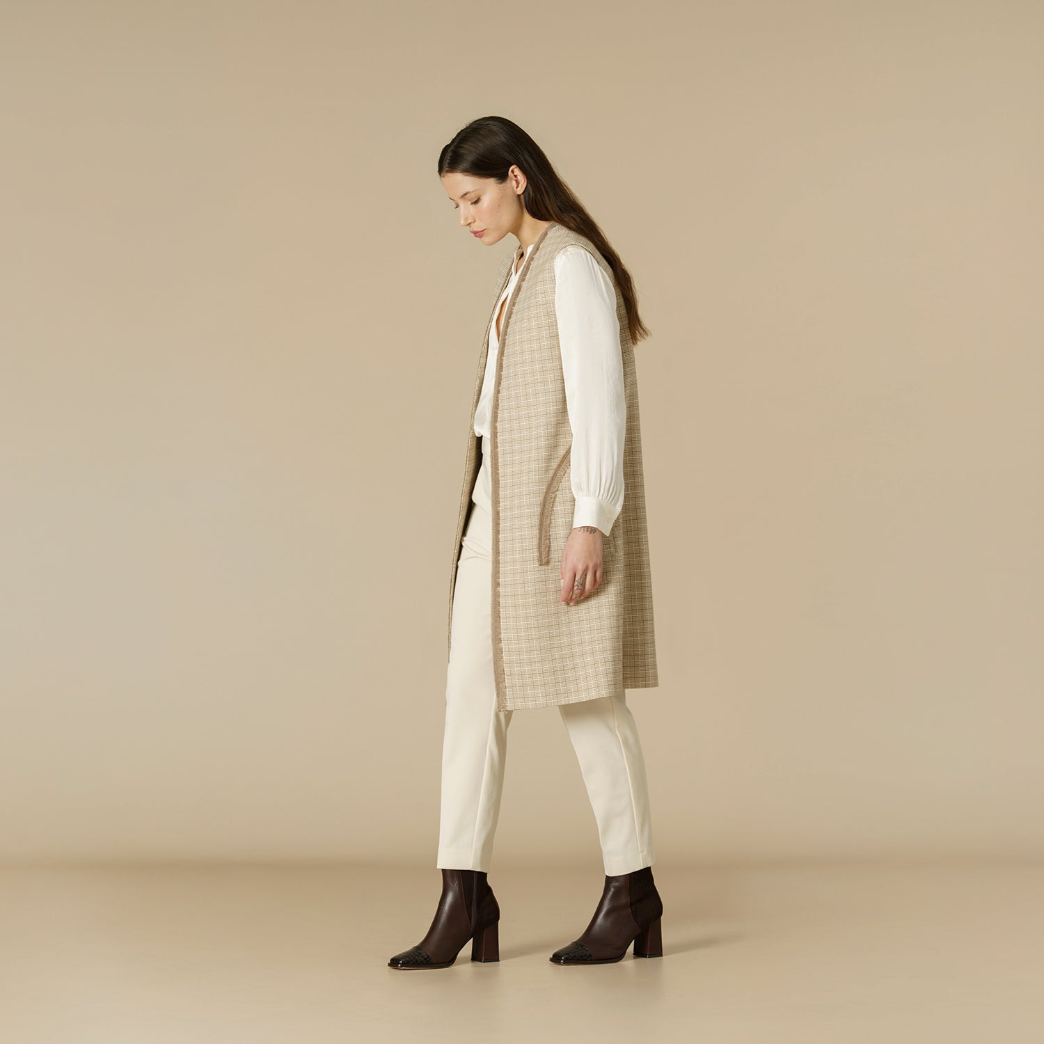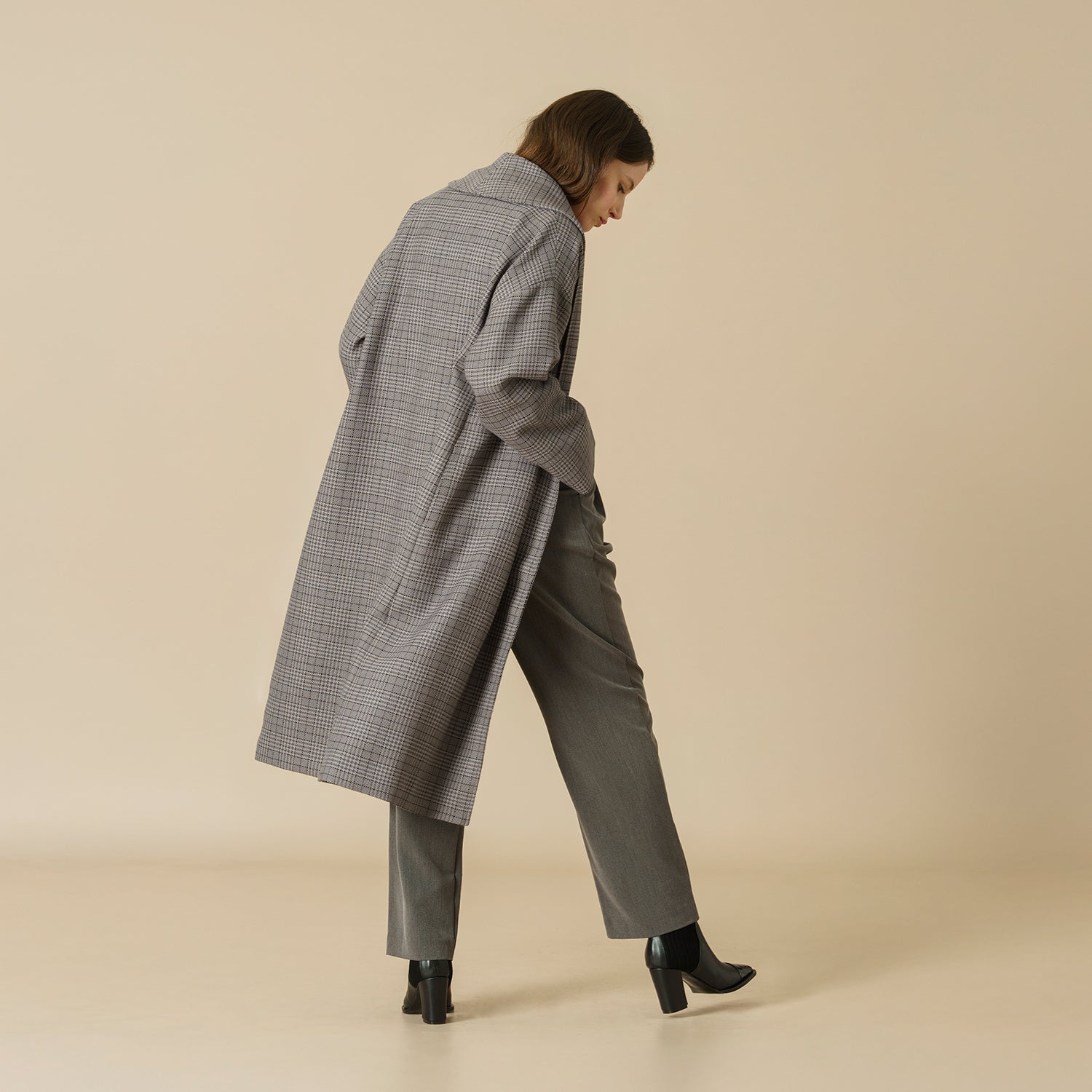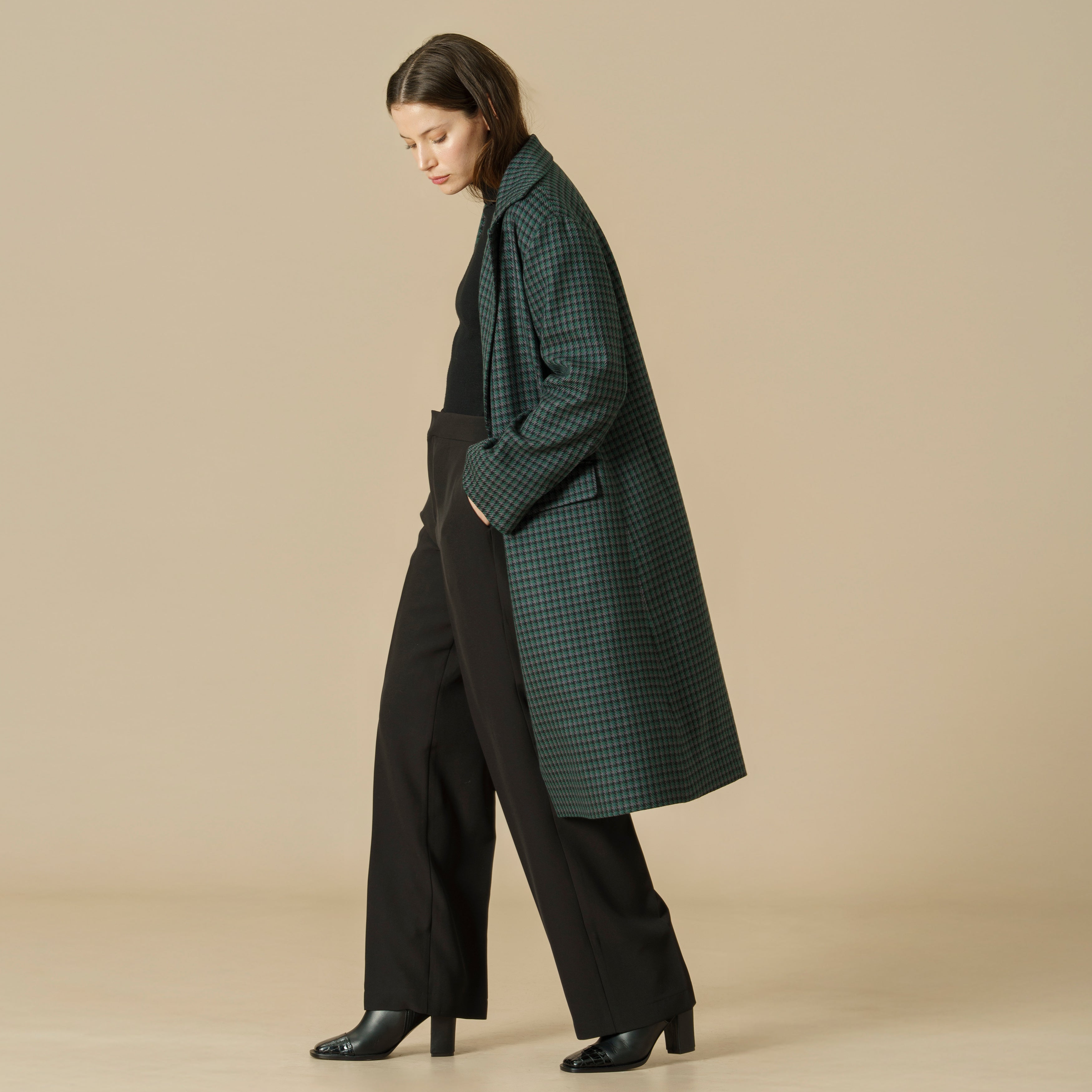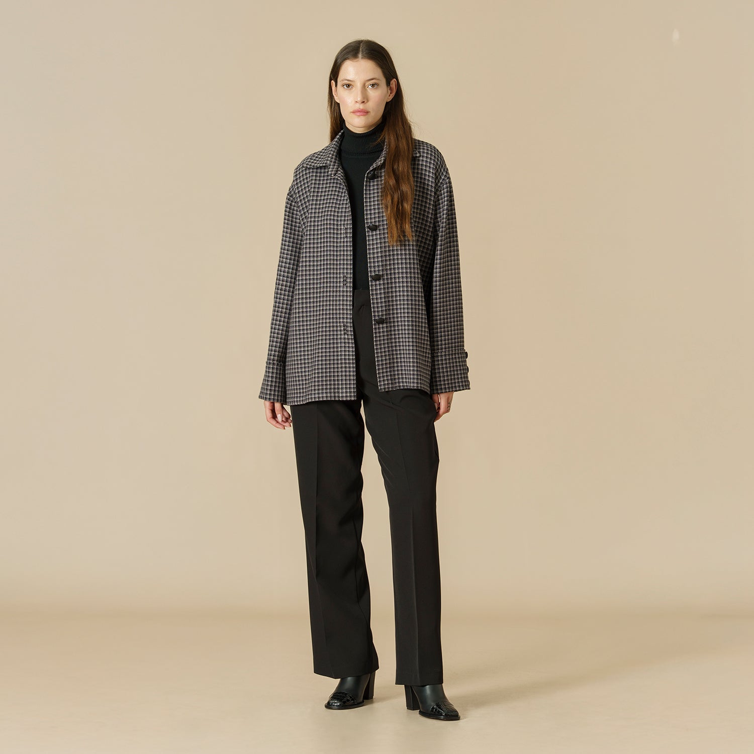 Con un diseño de pied de poule en tonos grises y cuello estilo italiano, es una prenda clásica que destaca por su elegancia y sobriedad.