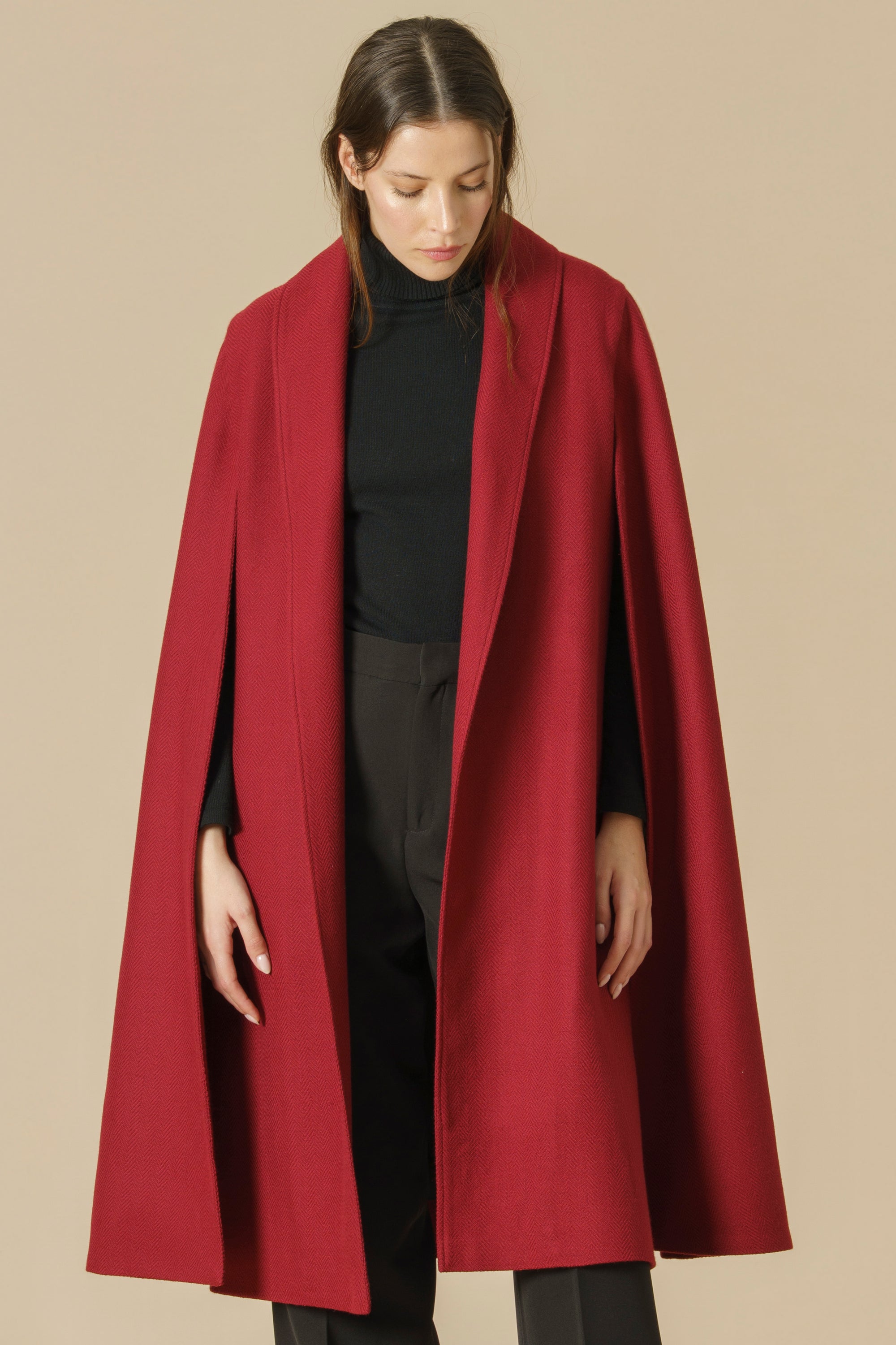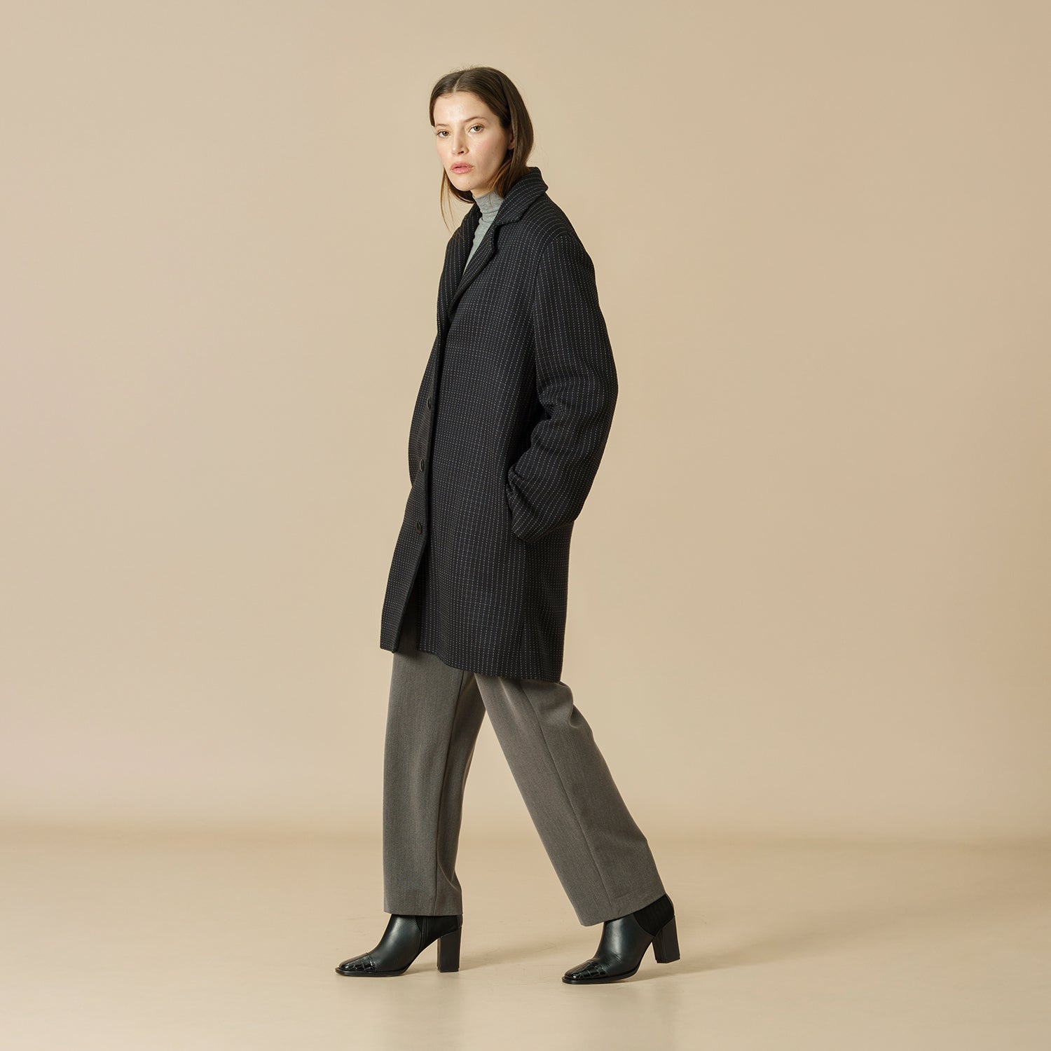 Con solapas de pico y una silueta clásica, es una prenda cuidadosamente elaborada que aporta gran elegancia y sofisticación