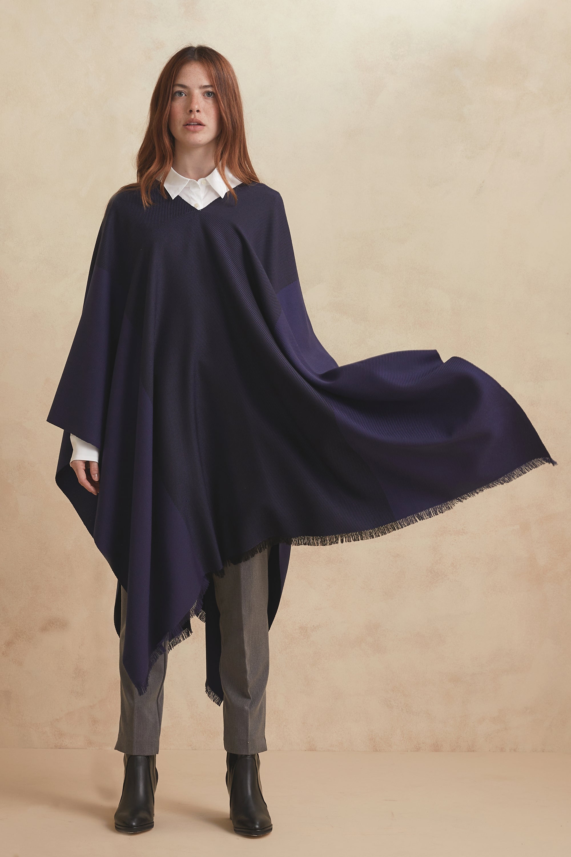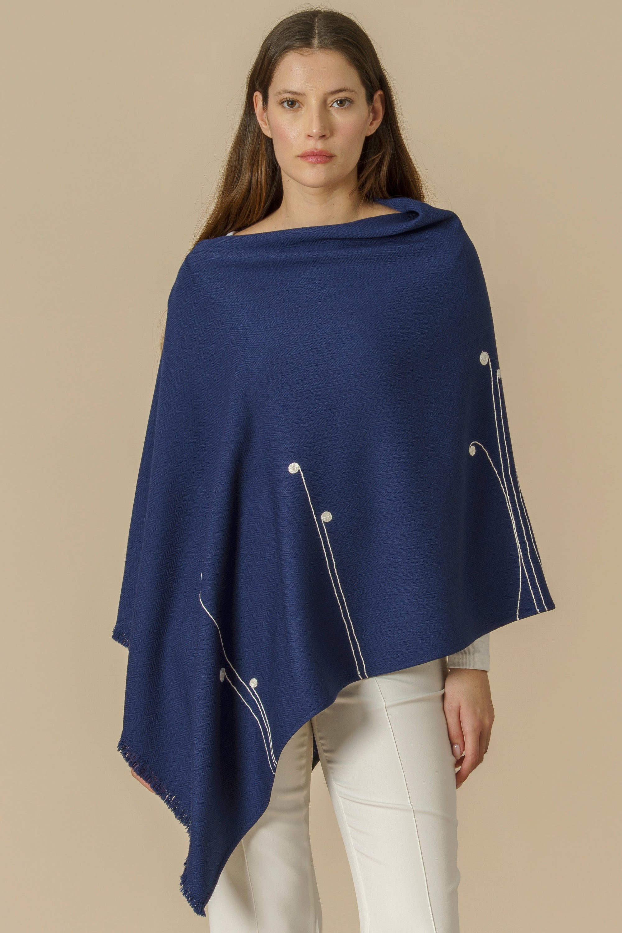 Está hecho 100% de lana de oveja merino patagónica con un diseño pied de poule y finalizado con botones cubiertos de manera artesanal en cuero argentino.